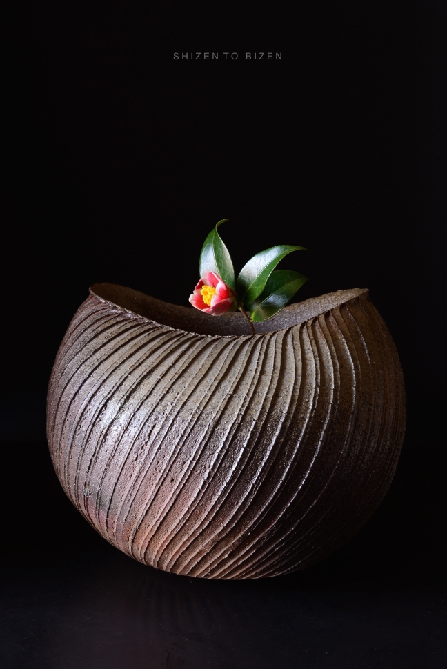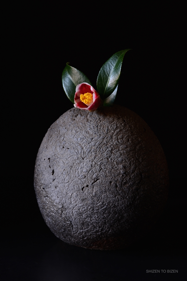 A camellia and Bizen ceramic vase
