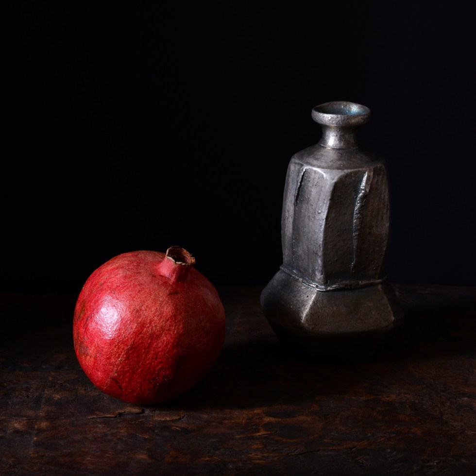 Red fruit and silver sake bottle